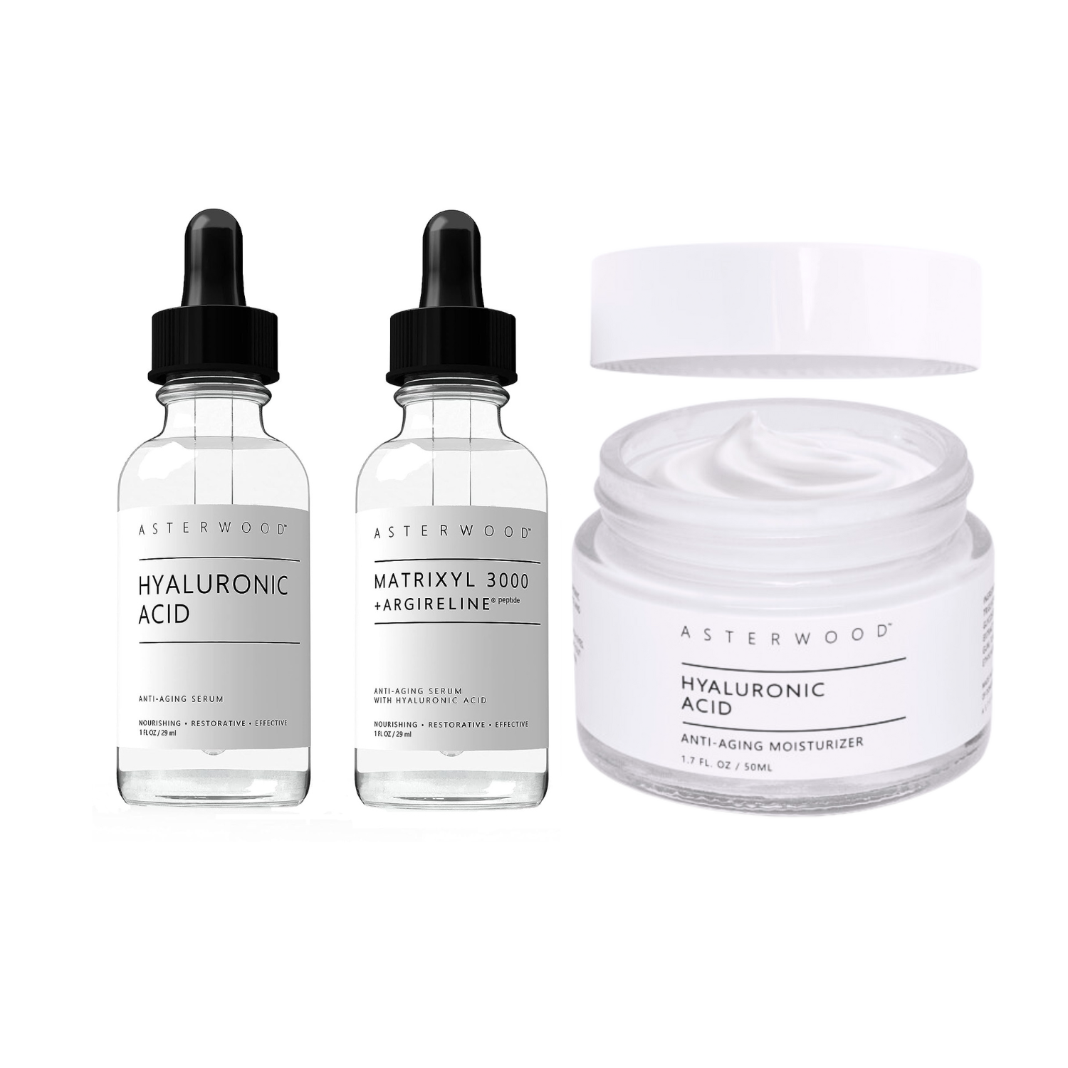 The Asterwood Hydration & Anti-Aging Bundle includes our Hyaluronic Acid Serum, Matrixyl 3000 + Argireline Serum, and Hyaluronic Acid Moisturizer. This trio deeply hydrates, boosts collagen, and minimizes fine lines, leaving skin plump, smooth, and youthful. Perfect for all skin types seeking lasting moisture and visible anti-aging benefits.